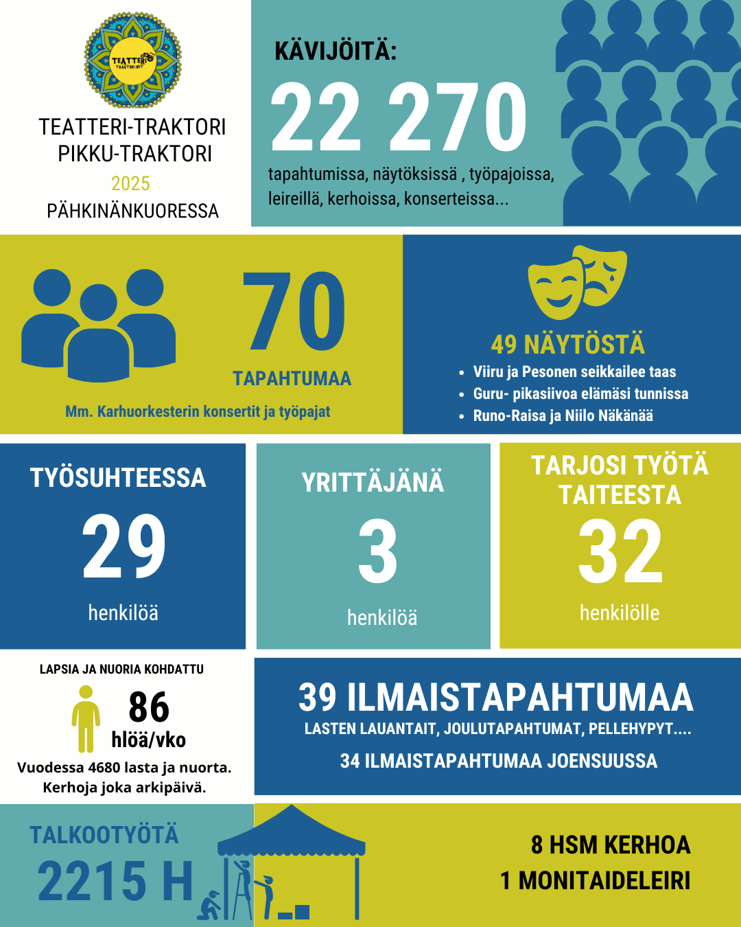 Teatteri-Traktori on ammattivetoinen teatteri, jonka päätehtävä on kiinnostavan ja uutta luovan esittävän taiteen tekeminen. Ensisijaisesti olemme siis ammattiteatteri ja teemme esityksiä, työpajoja ja kulttuuritoimintaa huomioiden lapset ja perheet. Esiintyjistä yli 60 % on taidealan ammattilaisia ja tuotantotiimistä (ohjaaja, tuottaja, skenografi, puvustaja, lavastajat, muusikko, teknikot) ovat 100 % alan koulutettuja ammattilaisia.